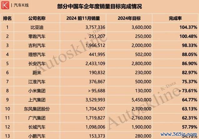 哈弗品牌和长城皮卡证明平平,致使长城汽车1~11月累计销量同比下滑1.81%,为109.8万辆。2024仅剩临了一月,长城汽车只完成年度销量目标的57.79%,在《汽车K线》统计的13家上市车企中,排行榜单倒数第2。