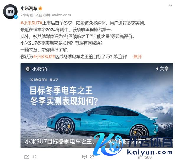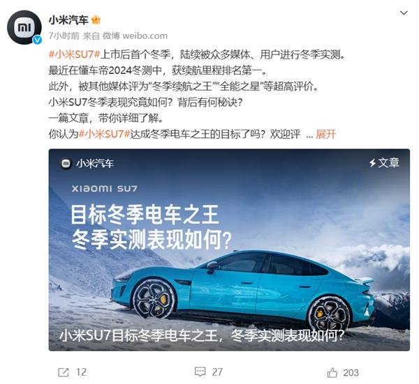 快科技 1 月 13 日音书,小米汽车秘书,小米 SU7 上市后首个冬季,继续被宽敞媒体、用户进行冬季实测。