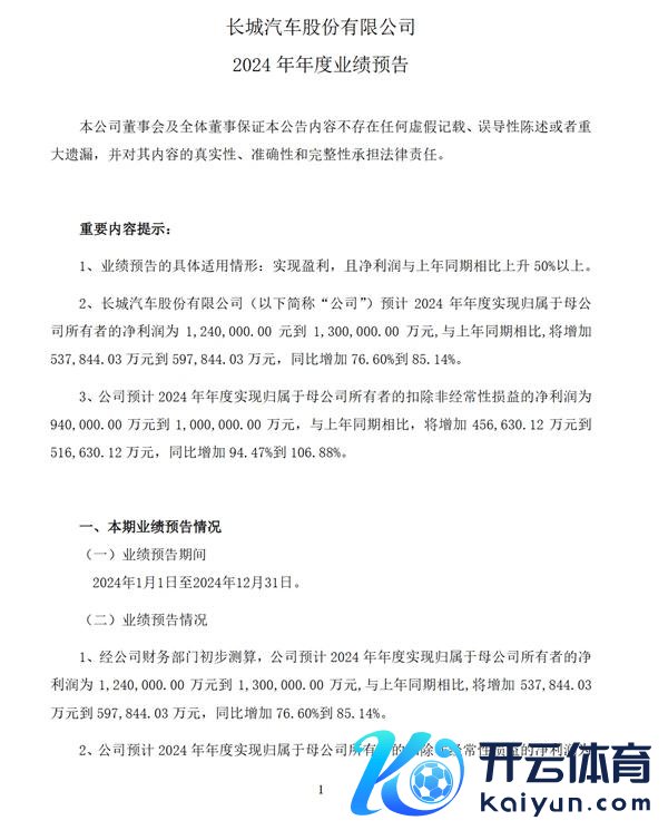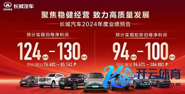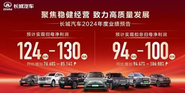 1 月 14 日,长城汽车发布客岁年度功绩预报。官方预测客岁终了包摄于母公司总共者的净利润为 124 亿元至 130 亿元。这一数据与客岁同期比较增多 53.78 亿元到 59.78 亿元,增长 76.60% 到 85.14%。2024 年年度终了包摄于母公司总共者的扣除非往往性损益的净利润预测为 94 亿元至 100 亿元,与上年同期比较预测增多 45.66 亿元 -51.66 亿元,同比增多 94.47% 至 106.88%。