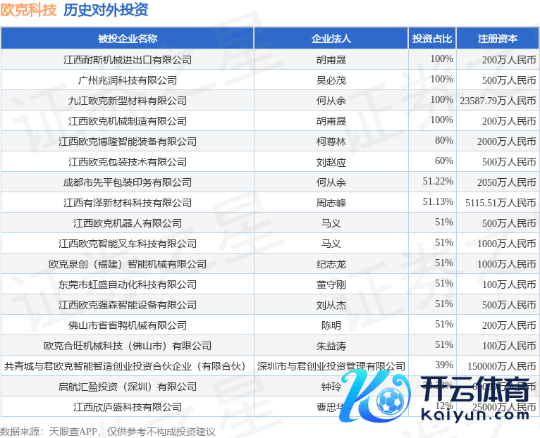 本站音问,说明天眼查APP显现,欧克科技(001223.SZ)新增扫数对外投资事件,被投资公司为欧克泉创(福建)智能机械有限公司,法定代表东谈主纪志龙,投资占比为51%。该公司从事缱绻机、通讯和其他电子建造制造业开yun体育网,注册本钱为1000万东谈主民币。现在,欧克科技共存在对外投资18项,详见下表: