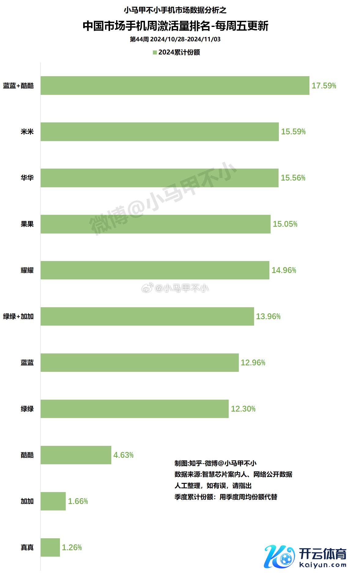 这是一份禁止2024年11月3日国内本年各手机品牌激活量的累计名次,数据起原图上还是写的很了了了。凭证名次可以看到vivo第一,商场份额为17.59%,名按序二的是,商场份额为15.59%,名按序三的是华为,商场份额为15.56%,名按序四的是苹果,商场份额为15.05%;名按序五的是荣耀,商场份额14.96%,名按序六的是OPPO,商场份额为13.96%。另外数据还显现了子品牌的份额,其中iQOO单独的份额为4.63%,一加单独的份额为1.66%,realme单独的份额为1.26%。可以看出一加+realme齐不是iQOO的敌手,足以解说iQOO当今的销量的确子品牌的王者。