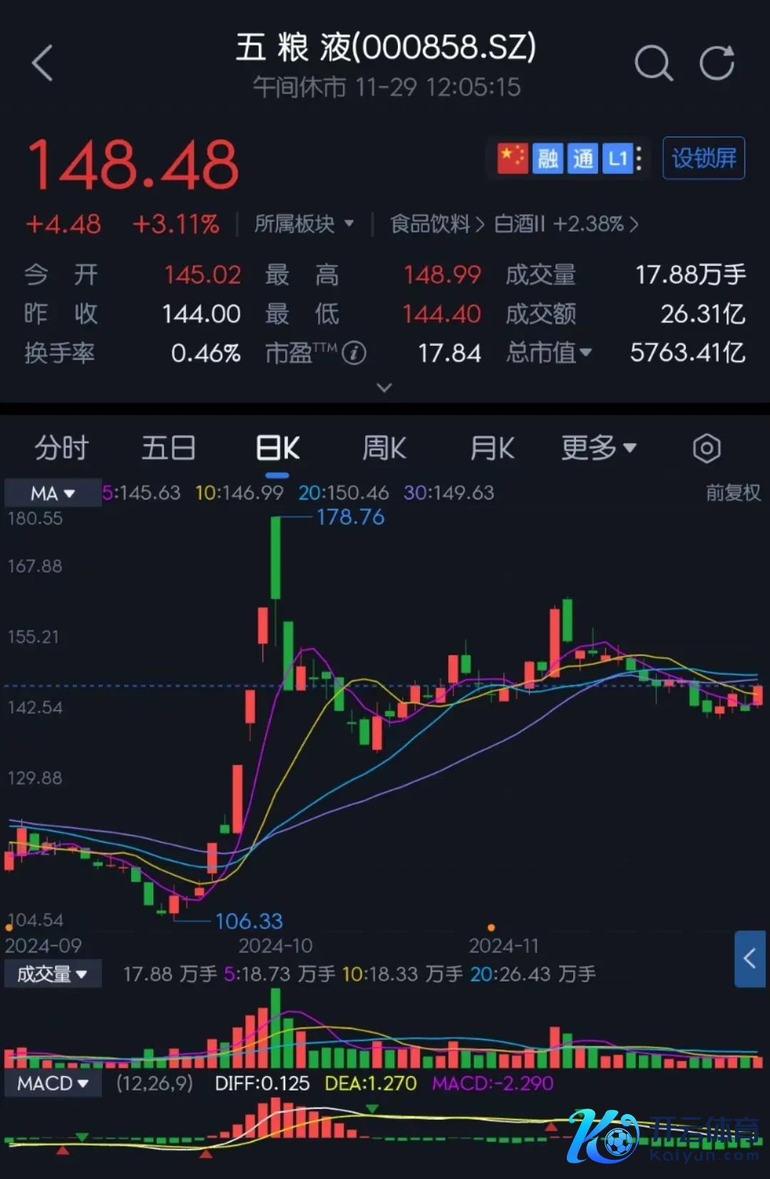 11月29日,五粮液(000858)以145.02元的价钱高开,随后股价一起走高,为止午间收盘高潮3.11%,报148.48元,总市值5763亿元。