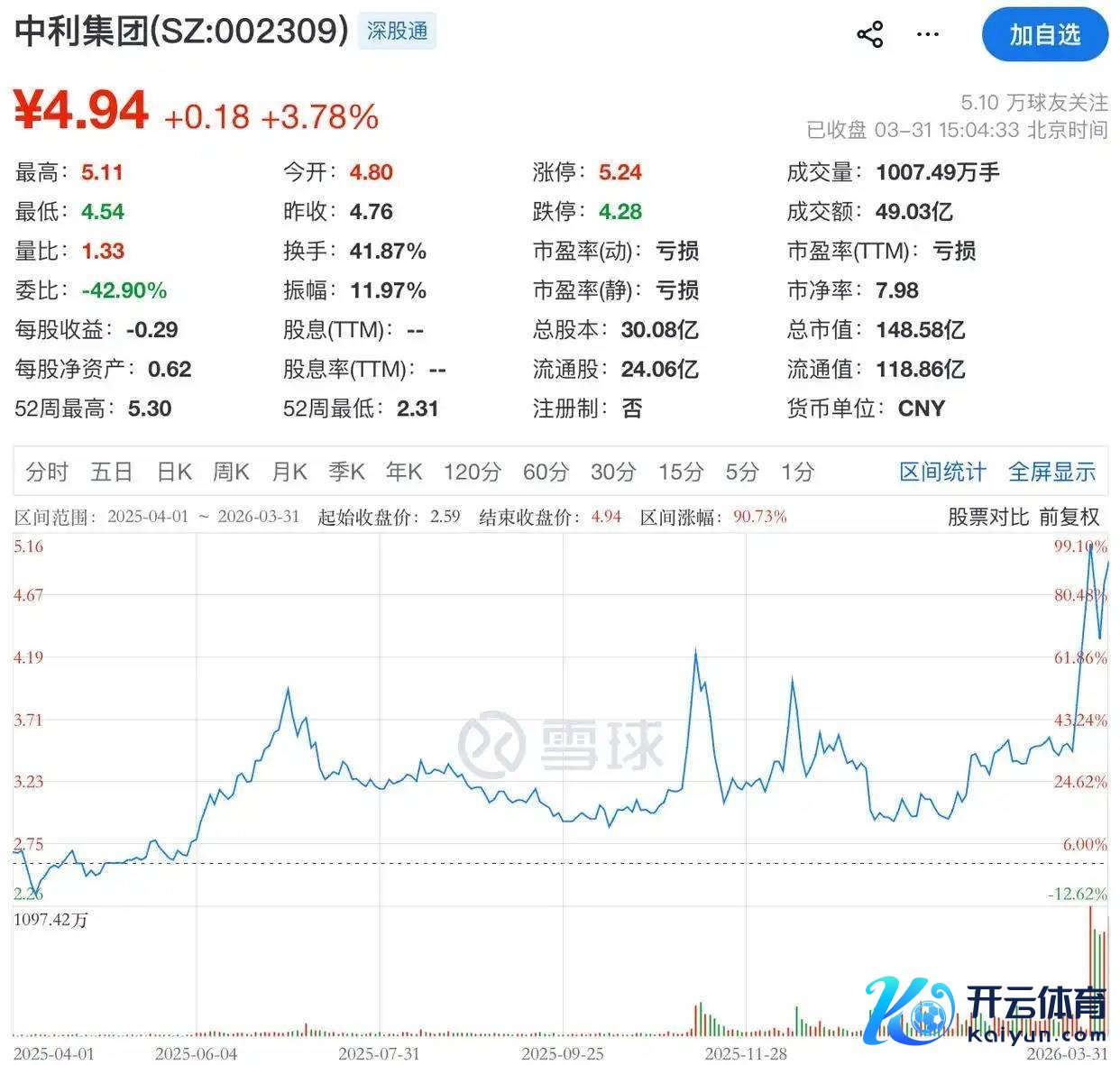 二级市集上,限制3月31日收盘,中利集团涨3.78%,报4.94元/股,总市值148.58亿元。