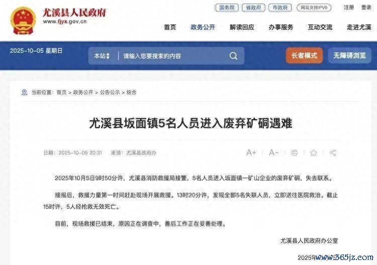 10月5日开云体育,据福建省三明市尤溪县政府网站音书,2025年10月5日9时50分许,尤溪县消防扶持局接警,5名东谈主员参预坂面镇一矿山企业的放胆矿硐,失去关联。